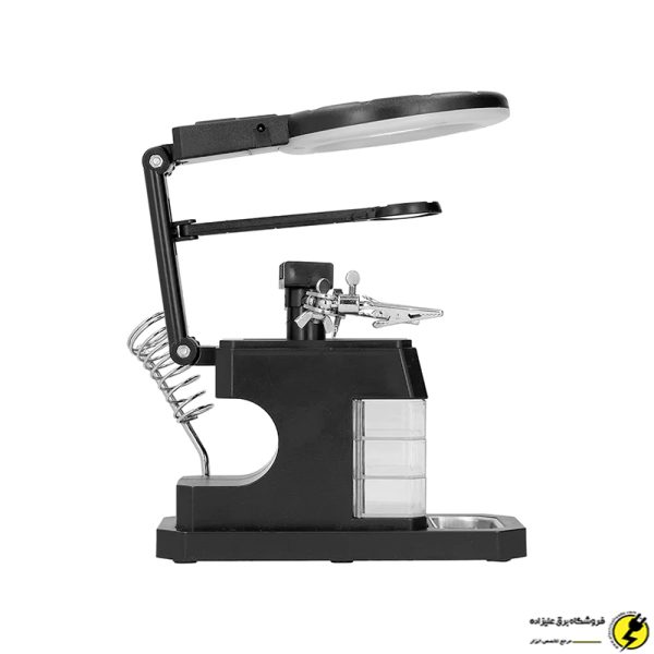 گیره چند منظوره لحیم کاری حرفه ای ذربین دار با منبع نور قابل تنظیم و دارای ذره بین، مناسب برای تعمیر و نگهداری برق، حکاکی، کار دستی و آزمایشگاه و …. دارای چرا LED دارای تنظیم نور حرفه ای که به واسطه باتری و همچنین کابل برق مستقیم می تواند برای شما روشن شود . همینطور این محصول دارای دو گیره سوسماری فوق العاده قوی برای نگهداشتن برد الکترونیکی شما برای لحیم کاری می باشد . ضمن اینکه پایه و بازوی آن کاملاً قابل تنظیم بوده و شما می توانید آنرا به زاویه مورد نیاز خود تنظیم کنید .